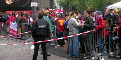 Autobus w eskorcie kilku radiowozów zawiózł nas pod sam stadion. Jak okazało się na miejscu, to nie jedyna okazja, na jaką się załapaliśmy. Pod stadionem dowiedzieliśmy się, iż jako "specjalna grupa" nie musimy wchodzić razem z wszystkimi, tylko zostały nam otworzone bramy i po dokładnym przeszukaniu bez kolejki weszliśmy na stadion.