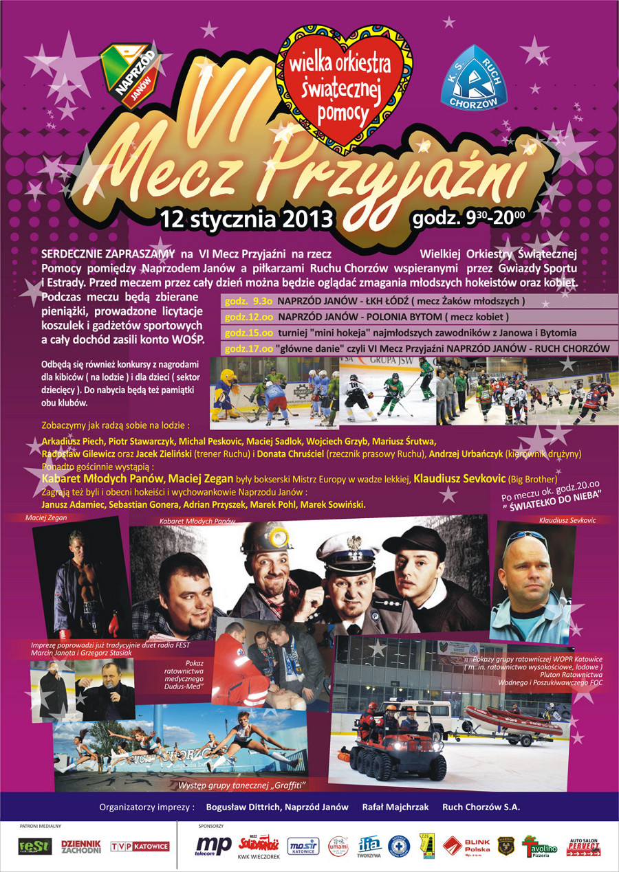 Hokeiści Naprzodu Janów oraz piłkarze Ruchu Chorzów, wspierani przez Gwiazdy Sportu i Estrady, już po raz szósty zagrają ze sobą na lodzie dla Wielkiej Orkiestry Świątecznej Pomocy.