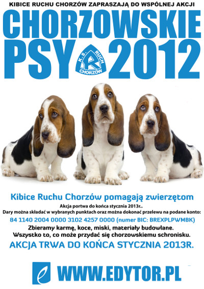 Podczas zeszłorocznej akcji "Chorzowskie Psy" zebrano łącznie blisko 1900 zł. Teraz, zaledwie na półmetku, kibice mają już ponad 1300 zł, które przeznaczą na karmę dla psów!