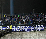 100 kibiców Zagłębia z trzema flagami "Na wyprawie", "O.C.B.'03" oraz "fanatyczni chojnowianie".