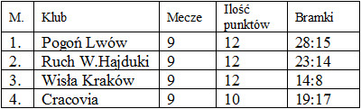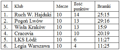 Ruch w całych rozgrywkach (eliminacyjnych i mistrzowskich) wygrywa 14 meczy, 6 przegrywa, ani jednego remisu. Tabela końcowa.