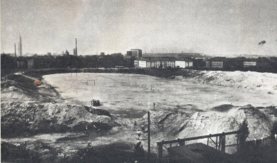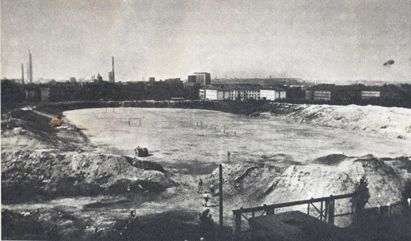 Zdjęcie: "Księga jubileuszowa 50 lat Ruchu Chorzów". Budowa stadionu rok 1934.