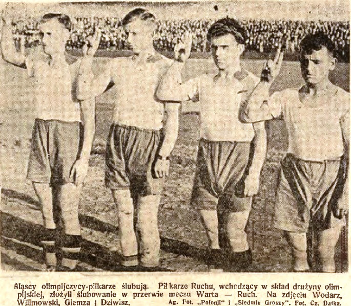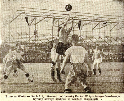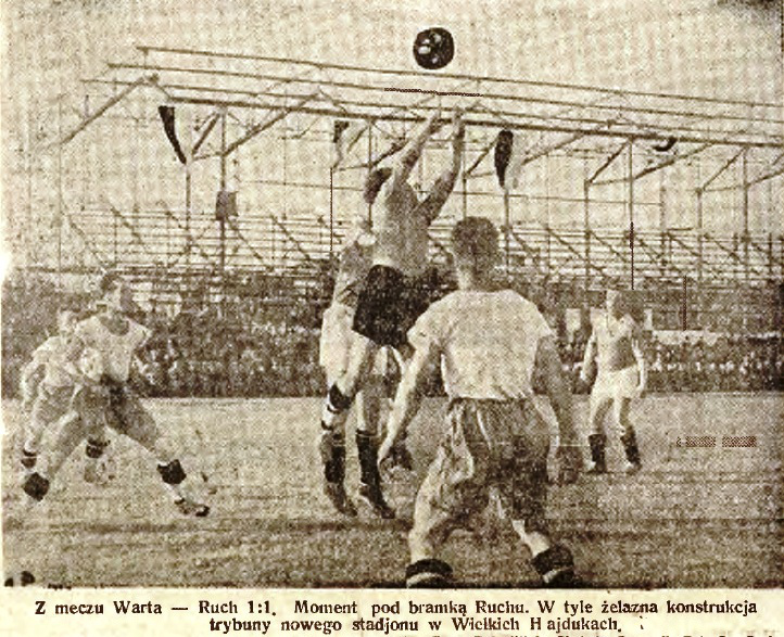 Śląski świat sportowy przeżywał wczoraj bodaj jedną z najpiękniejszych chwil od chwili należenia do Polski. Marzenia tysięcy sportowców i klubów dorobienia się stadjonu o reprezentacyjnych rozmiarach ziściły się wczoraj dzięki wybitnym staraniom zarządu gminnego Wielkie Hajduki oraz zarządu K.S. "Ruch". Tam, gdzie kiedyś były doły i wyboje, dziś stanął przepiękny stadjon, bodajże jeden z najpiękniejszych w Polsce. Dzięki temu stadjonowi Śląsk doczekał się, że wreszcie będzie terenem spotkań między państwowych (...). Przeszło 25.000 widzów zapełniło stadjon "Ruchu", gdzie wczoraj z okazji 15-lecia "Ruchu" rozegrany został między innemi mecz ligowy pomiędzy zespołem gospodarzy i Wartą poznańską.