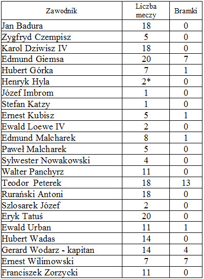 Najlepszym strzelcem drużyny Ruchu został Teodor Peterek, komplet minut boiskowych zaliczył tylko Edmund Giemsa, a w sumie wystąpiło 23 zawodników.