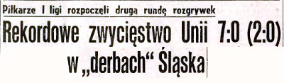 Tego chyba nikt nie oczekiwał, że w derbach Śląska zazwyczaj wyrównywanych i zaciętych, padnie najwyższy wynik w tegorocznych rozgrywkach I ligi. Tym bardziej, że pierwsze minuty gry stały pod znakiem naporu Budowlanych, którzy przesiadywali pod bramką Wyrobka. Gdy jednak napastnicy Unii, a zwłaszcza Cieślik strzelali bez pudła - i po przerwie wyśrubowali wynik na 7:0 (2:0). Łupem bramkowym podzielili się Cieślik (3) oraz Pala, Mateja, Pohl i Suszczyk. To najwyższe ligowe zwycięstwo Ruchu nad lokalnym rywalem.