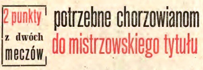 Sędzia Koczner widział więcej i lepiej niż widownia, która pod koniec starała się obarczyć go winą – chyba tylko, słabej gry swoich pupilków. Na górze tabeli był ścisk, za Ruchem i Legią czaiły się drużyny Odry Opole i Górnika Zabrze.