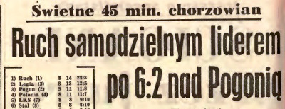 W szóstej kolejce do Chorzowa przyjechało Zagłębie Sosnowiec, w pierwotnym terminie mecz nie doszedł do skutku ze względu na święto "Trybuny Robotniczej". Jako nowy termin wyznaczono datę 19 września. Na trybunach zasiadło 40 tysięcy kibiców obu drużyn. Ruch wygrał 2:0 po golach strzelonych przez Piechniczka w 30 minucie oraz Hermana w 51 minucie meczu. Prasa napisała:
