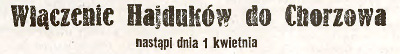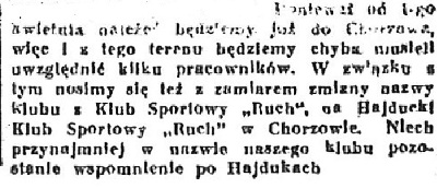 Ponieważ od 1 kwietnia 1939 roku należeć będziemy już do Chorzowa, więc i z tego terenu będziemy musieli uwzględnić kilku pracowników. W związku z tym nosimy się też z zamiarem zmiany nazwy klubu z Klub Sportowy »RUCH« na Hajducki Klub Sportowy »RUCH« w Chorzowie, niech przynajmniej w nazwie naszego klubu pozostanie wspomnienie po Hajdukach. Hajducki Klub Sportowy w skrócie HKS "RUCH" Chorzów.