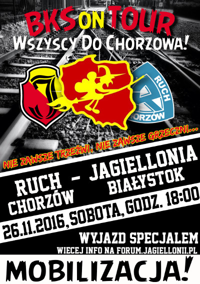 Kibice Jagiellonii Białystok od początku listopada prowadzą wielką mobilizację na wyjazd do Chorzowa. Fanatycy "Jagi" przyjadą na Górny Śląsk pociągiem specjalnym, a ich celem jest zapełnienie sektora gości.