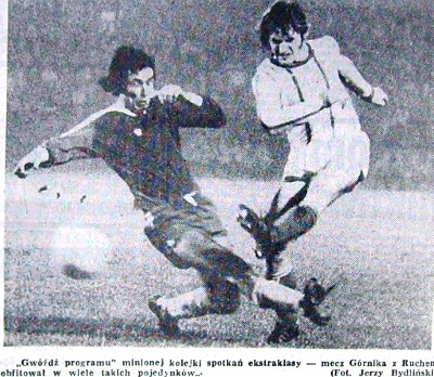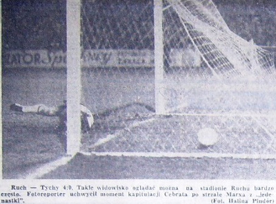 Było tak, Ruch uzyskał rzut rożny. Tłoczno zrobiło się pod bramką Tomaszewskiego. Pierwszy strzał bramkarz sparował w pole, powstało nieopisane zamieszanie, piłka wyszła na wolne pole, prosto do skrzydłowego chorzowian. Posłał ją w gąszczu nóg w sam róg (...). Co ciekawe na ławce nie widziano dokładnie tej bramki, ale powtarzano słowa: