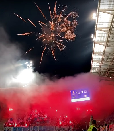 Piro odpalone zostało trzykrotnie w trzech różnych wariantach. Ba, była również pirotechnika pozastadionowa, odpalona przez sekcję zakazowiczów, która pięknie dopełniła całą prezentację.