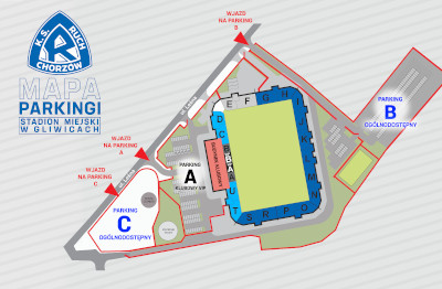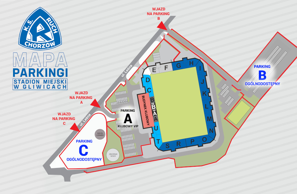 Kibicom udostępnione zostaną trzy parkingi – A, B i C. Wjazdy na każdy z nich znajdują się przy ul. Leśnej (patrz: mapka). Pojemność ogólnodostępnych parkingów B i C to łącznie ok. 300 miejsc. Na parking A będą mogły wjechać osoby posiadające karty parkingowe, które dotychczas obowiązywały na stadionie przy Cichej 6 w Chorzowie.