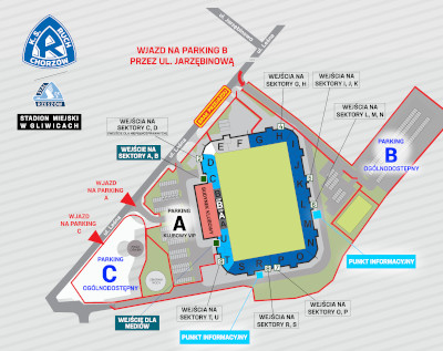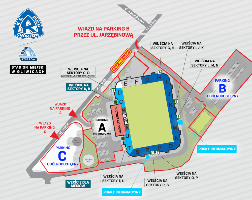 Wszystkich kibiców, którzy wybierają się do Gliwic na mecz ze Stalą Rzeszów, zachęcamy do wcześniejszego przybycia na stadion. Pozwoli to uniknąć niepotrzebnych kolejek przy bramach wejściowych, które mają swoją ograniczoną przepustowość, a w niedzielę spodziewamy się kompletu publiczności. Pragniemy podkreślić, że na obiekt będzie można wchodzić WYŁĄCZNIE wejściem wskazanym na bilecie. Karnetowicze oraz osoby, które mają nabitą wejściówkę na kartę kibica, powinny sprawdzić swoje miejsce logując się do systemu na bilety.ksruch.com. Wchodząc na stadion należy kierować się do wejść przypisanych do konkretnych sektorów, zgodnie z poniższą mapką.