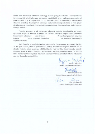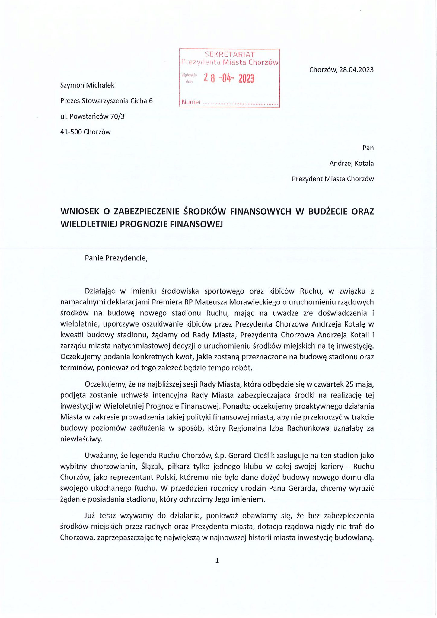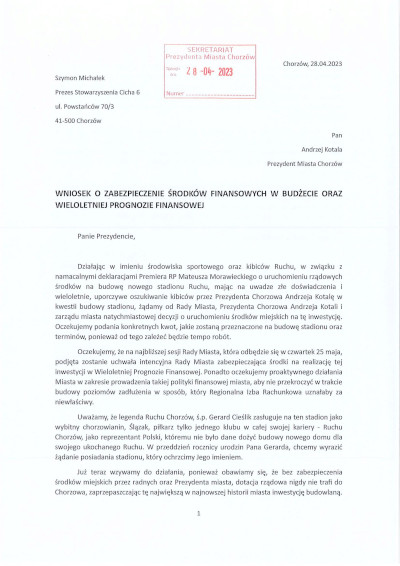 Prezesi Stowarzyszeń Cicha 6, Wielki Ruch oraz SK 1920 złożyli w Kancelarii Prezydenta Miasta i Kancelarii Rady Miasta Chorzów wniosek o zabezpieczenie środków finansowych w budżecie oraz wieloletniej prognozie finansowej. Chodzi oczywiście o nowy stadion dla Ruchu.