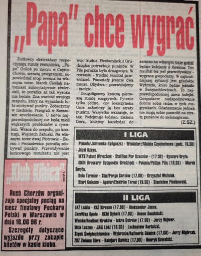Mobilizacja w szeregach chorzowskich kibiców nie umknęła również prasie, która zapowiadała liczny przyjazd kibiców Niebieskich do stolicy: W Warszawie Ruch ma dopingować blisko 2 tysiące kibiców, którzy wybierają się na ten mecz specjalnym pociągiem. Nasza redakcja ufundowała dla Ruchu lodówkę pełną piwa. (Trybuna Śląska, Nr 139, 15-16 czerwca 1996, str. 10 )