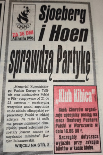 Kolejną ważną kwestią było poinformowanie kibiców, że taki pociąg będzie organizowany. Ruch swoje ostatnie spotkanie w sezonie rozgrywał dopiero 12 czerwca, czyli 4 dni przed finałem, więc kibice Ruchu zdecydowali się na umieszczenie w gazecie ogłoszenia o planowanym pociągu do stolicy. Był 1996 rok - kontynuuje Hetman - Nie było telefonów komórkowych, a co dopiero Internetu i mediów społecznościowych. Trzeba była jakoś nagłośnić to, że jest wyjazd pociągiem specjalnym, więc zdecydowaliśmy się zamieścić reklamę na 1 stronie w katowickim "Sporcie", jak również w dodatkach sportowych innych gazet. Był to o tyle duże wydarzenie, że był to pierwszy w latach 90-tych pociąg specjalny kibiców Ruchu. Odezwa ze strony kibiców przeszła nasze najśmielsze oczekiwania!
