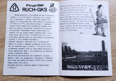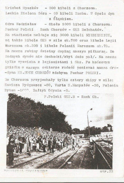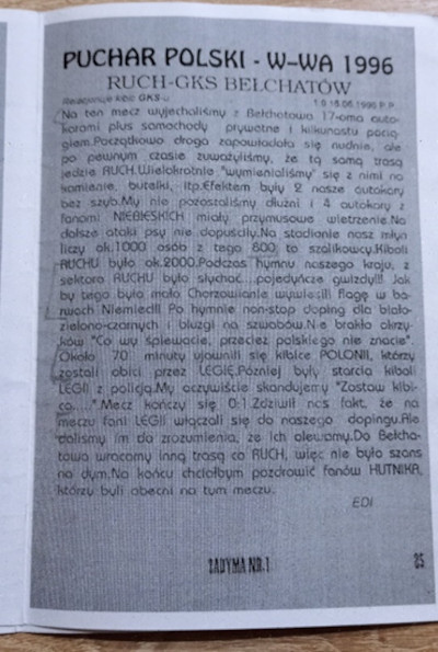 Krótką kibicowską relację z tego finału możemy również znaleźć w ogólnopolskim zinie wydawanym w Świętochłowicach: Na stadionie melduje się 3000 kiboli NIEBIESKICH, są także kibole GKS w sile ok. 700 oraz kibole Legii Warszawa ok. 300 i kibole Polonii Warszawa ok. 70. Na meczu robimy świetny doping naszym piłkarzom. Do żadnych dymów nie dochodzi (zbyt dużo pał). Na meczu tylko wyzwiska z legionistami i GKS. Po końcowym gwizdku w naszym sektorze radość, ponieważ nasza drużyna KS RUCH Chorzów zdobywa Puchar Polski. (Official Hooligans Zine, Nr 5/96, Świętochłowice, str. 23)