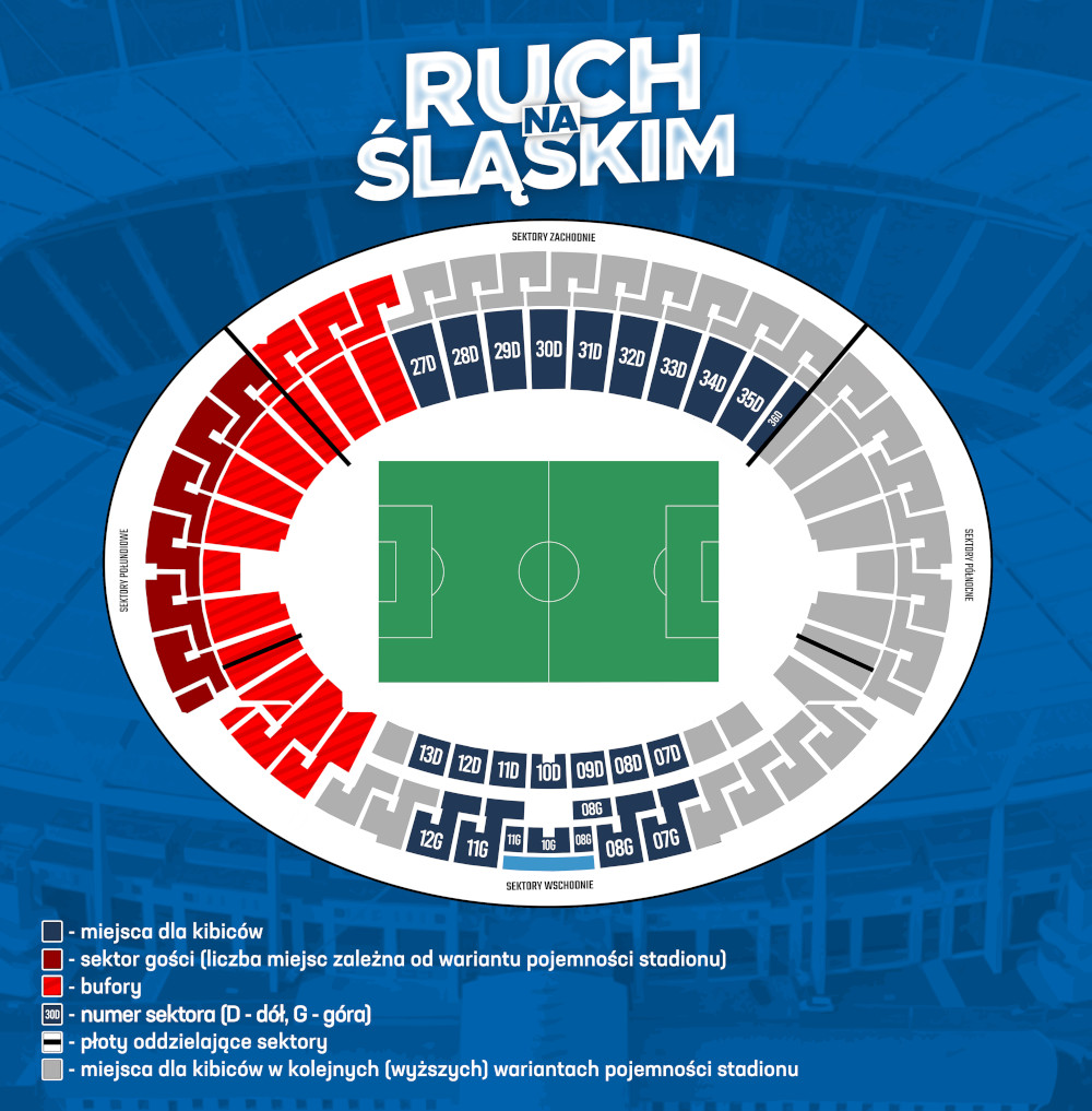Umowa zawarta ze Stadionem Śląskim jest na tyle elastyczna, że daje Klubowi możliwość organizacji meczów ligowych w kilku różnych wariantach dopuszczonej pojemności. W związku z powyższym karnety można kupować wyłącznie na te miejsca, które będą dostępne bez względu na wybrany wariant pojemności. Wariant podstawowy, na którym się opieramy, to 15 882 miejsca. Przedstawia go poniższa mapa: