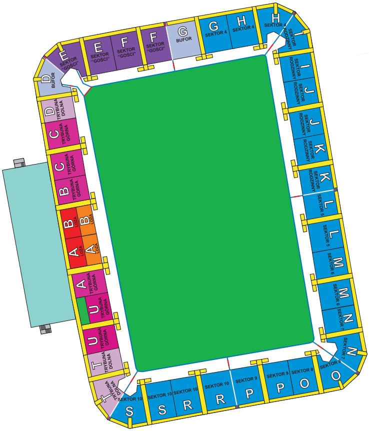 część sektorów A i B oznaczone kolorem pomarańczowym = Trybuna Górna