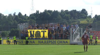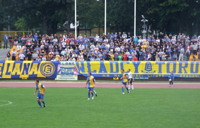 Elana Toruń Pierwszy wyjazdowy ligowy mecz Elany z Lechem Rypin został przełożony na wniosek policji z powodu "braku monitoringu". Dopiero w drugiej kolejce Elanowcy rozegrali pierwsze spotkanie w tym sezonie, zmierzyli się na własnym stadionie z Moto-Jelczem Oława. W młynie 300 osób, w tym delegacje Ruchu i Widzewa. Płoty przyozdobiono 10 flagami, w tym m.in. "Władcy Torunia", "Toruńska Elana", "Grubasy" oraz "Elana Toruń". Na meczu pojawiło się około 50 kibiców gości, którzy również załapali się na "spotkanie" z Elanowcami. Co do meczu, to na boisku zakończyło się bezbramkowym remisem.