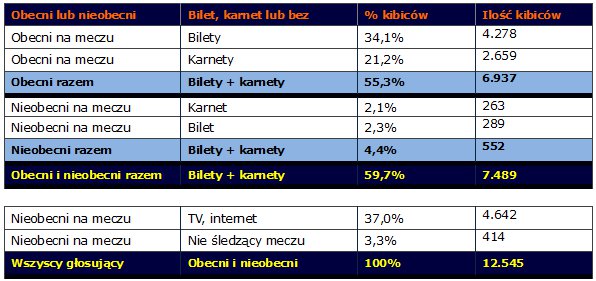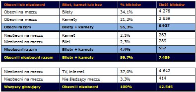 Na podstawie przeprowadzonej sondy sporo możemy wyliczyć. Na pewno dość precyzyjnie możemy określić ilość sprzedanych karnetów. Potrafimy także oszacować ilość sympatyków, którzy obecnie aktywnie śledzą losy Ruchu Chorzów. A czego będziemy mogli się dowiedzieć za parę dni? Wkrótce przedstawimy ilu kibiców wybiera się na manifestację w sprawie stadionu. Zanim jednak to nastąpi, zachęcamy do przyjrzenia się specjalnie przygotowanej tabeli.