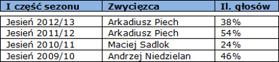 Analizując powyższe tabele warto zauważyć, że w obecnym składzie Ruchu znajdują się i Maciej Sadlok, i Andrzej Niedzielan, którzy byli uznawani zawodnikami rundy. Do dyspozycji, która przynosiła im uznanie kibiców sporo obu graczom jednak brakuje. Obaj w naszej zabawie uzyskali takie same wyniki, czyli po 1% głosów. Ich powrót do formy z pewnością sprawiłby, że głosowanie byłoby bardziej ciekawe.