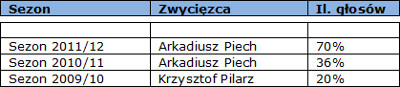 Już czwarty raz z rzędu Arkadiusz Piech zwyciężył w naszym głosowaniu, które odbywa się po pierwszej rundzie i po zakończeniu sezonu. Tym razem jego gra oraz waleczna i ambitna postawa przypadły go gustu blisko 40% sympatyków Niebieskiej eRki. Najlepszy wynik snajper Ruchu zanotował w ubiegłym sezonie, kiedy to zebrał aż 70% wszystkich oddanych głosów. Snajper Ruchu nie występował jednak we wszystkich spotkaniach, a po powrocie na boisko po kontuzji nie był już tak skuteczny jak w pierwszej części sezonu.