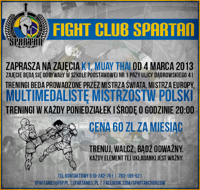 Fight Club Spartan zaprasza na zajęcia K1 oraz Muay Thai. Nabór rozpocznie się 4 marca, a zajęcia będą się odbywały w każdy poniedziałek i środę o godz. 20:00 w szkole podstawowej nr 1 przy ul. Dąbrowskiego 41 w Chorzowie.