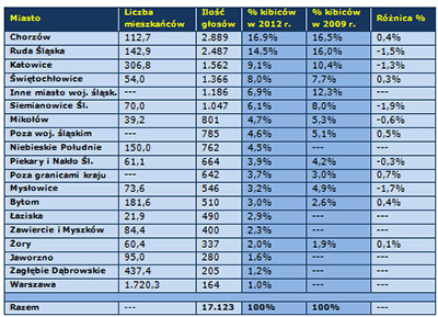 Tabela przedstawia miejsce zamieszkania kibiców Ruchu Chorzów w procentowym ujęciu. Dane zostały zestawione na podstawie dwóch przeprowadzonych głosowań na łamach naszego serwisu: w maju 2009 w i maju 2012.