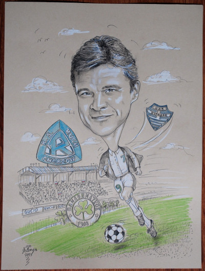 Jarosław Telenga, kibic "Niebieskich" z Mysłowic, wykonał ¶wietn± karykaturę Krzysztofa "Gucia" Warzychy, byłej gwiazdy Ruchu Chorzów i Panathinaikosu Ateny. Drugi gadżet to efektowna eRka z drewna. Jej autorem jest Edek z Fan Clubu Radlin.
