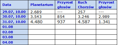 Na początku zajrzyjmy do Chorzowa. Przed dwoma dniami nasz klub z 257 głosami był daleko w tyle, dokładnie na szóstej pozycji. Dziś już jest na pierwszej, wyprzedzając drugie Planetarium o około 100 głosów. W ciągu 24 godzin sympatycy Niebieskiej eRki oddali 4320 głosów. Aby być spokojnymi zwycięstwa, Ruch Chorzów będzie potrzebował naszego dalszego wsparcia. Od pewnego czasu przewaga nie wzrasta, ba, nawet wydaje się maleć.