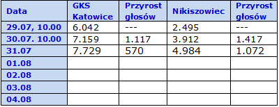 Tabela przedstawia rozkład głosów w plebiscycie portalu: katowice.naszemiasto.pl. Na pierwszym miejscu lider głosowania w dniu 29.07.2013 r., na drugim zaś wspierany przez naszych kibiców Nikiszowiec.