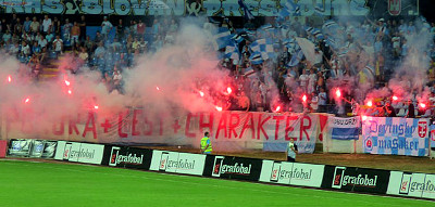 Pirotechnika fanów Slovana. Vid. SkSlovan.com.