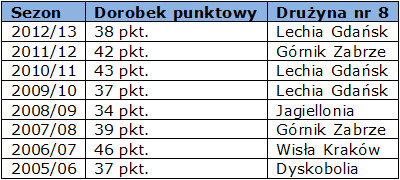 Tabela przedstawia dorobek punktowy ósmej drużyny po rozegraniu 30 kolejek w poprzednich ośmiu sezonach. W sezonie 2004/2005 w lidze występowało tylko 14 drużyn.