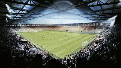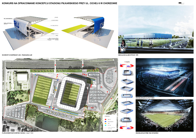 W galerii Stowarzyszenia Architektów Polskich w Katowicach ogłoszono dzisiaj wyniki konkursu na opracowanie koncepcji stadionu Ruchu Chorzów. Werdyktem Sądu Konkursowego pierwszą nagrodę otrzymała pracownia GMT Sp. z o. o. z Mysłowic, która została tym samym zaproszona do stworzenia projektu nowego obiektu "Niebieskich". Stadion w pierwszym etapie będzie miał 12 tysięcy miejsc, a następnie zostanie rozbudowany o kolejne cztery tysiące krzesełek. Jak powiedział nam prezydent miasta Andrzej Kotala, pierwsza łopata ma zostać wbita na przełomie sierpnia i września 2014 roku. Pierwsza trybuna ma być gotowa przed rundą wiosenną 2015.