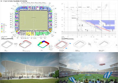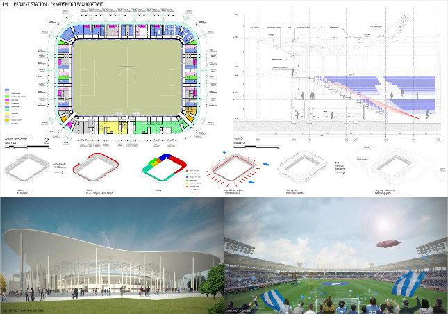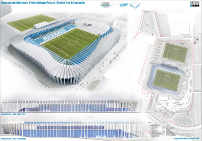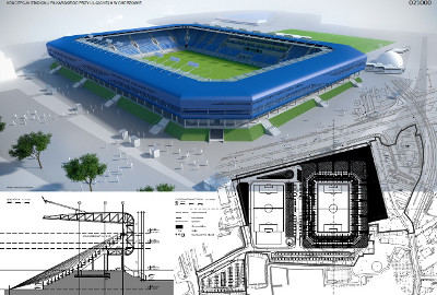Firma GMT otrzymała pierwszą nagrodę za innowacyjne podejście do elewacji obiektu stadionu w prosty i pomysłowy sposób odnoszący się do kolorów i nazwy klubu, za koncepcję uwzględniającą zmienną percepcję bryły w widoku z jadącego samochodu i perspektywy pieszego, czystą zdecydowaną formę obiektu właściwą dla skali inwestycji i porządkującą zastaną przestrzeń, za troskę o ekonomizację i prostotę zastosowanych rozwiązań technicznych i uzyskanie właściwej atmosfery klubowego stadionu w konwencji obiektu - maszyny, za prawidłową komasację programu kubaturowego w jednym budynku, za trafny podział na podetapy zgodne z oczekiwaniami i możliwościami finansowymi inwestora, za myślenie o właściwym przewietrzaniu i nasłonecznieniu stadionu, dobór materiałów i myślenie o ich trwałości i kosztach eksploatacji, za łatwy i nie wymagający dużych dodatkowych nakładów proponowany sposób rozbudowy do pojemności 16000 widzów.