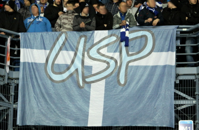Kibice Slovana obecni byli w 5 osób z flagą "USP" na wyjazdowym meczu "Niebieskich" z Lechem Poznań.