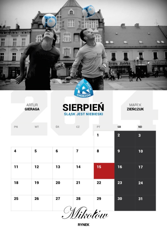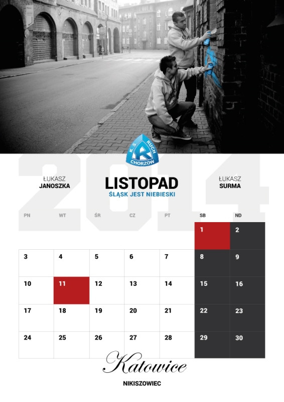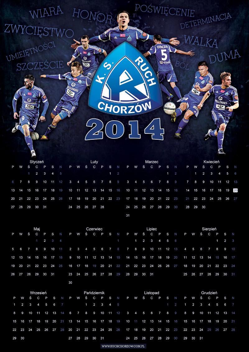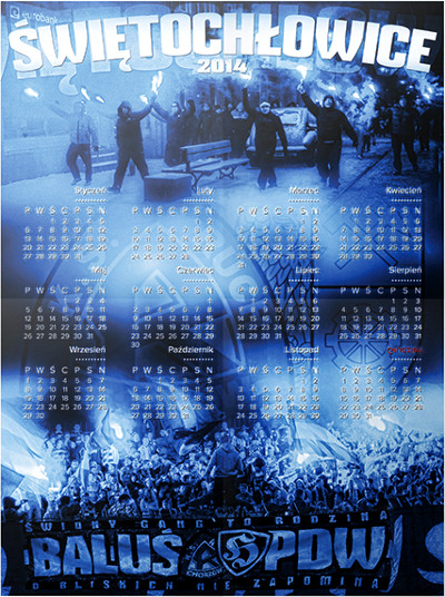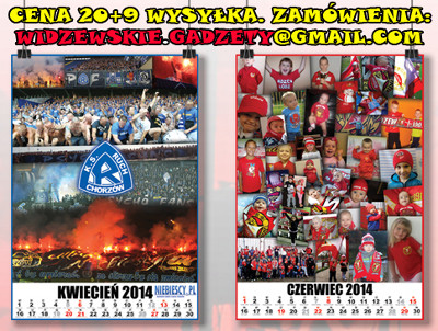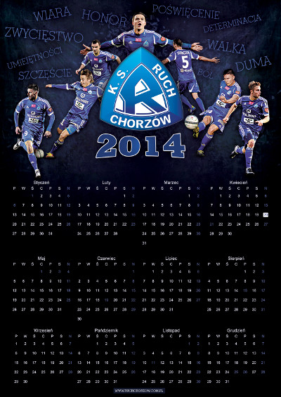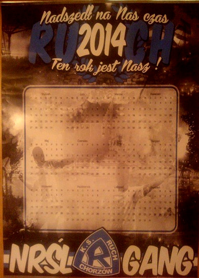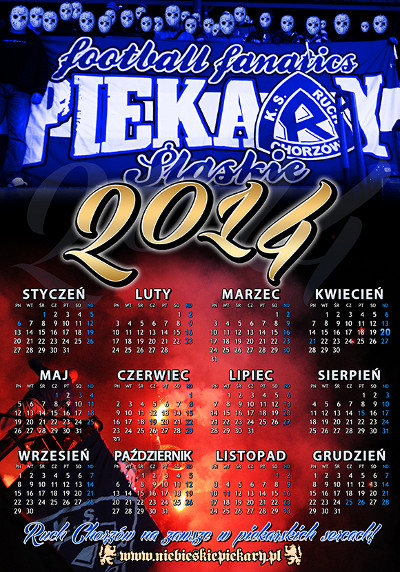 Klub oraz kibice Ruchu Chorzów wydali kilka kalendarzy na 2014 rok. W sklepie przy ulicy Cichej 6 pojawiły się dwa - planszowy oraz trzynastostronicowy. Na tę druga opcję zdecydował się także Fan Club Katowice, zaś na pierwszą fani z Piekar Śląskich, Rudy Śląskiej i Świętochłowic. O niebieskiej stronie w kalendarzu nie zapomnieli również sympatycy łódzkiego Widzewa, którzy jak co roku poświęcili nam kwiecień - z racji daty powstania Ruchu, czyli 20 kwietnia 1920 r. Zapraszamy do przejrzenia zdjęć kalendarzy na 2014 rok.