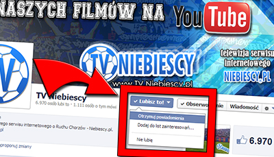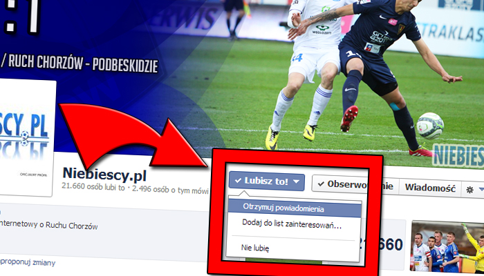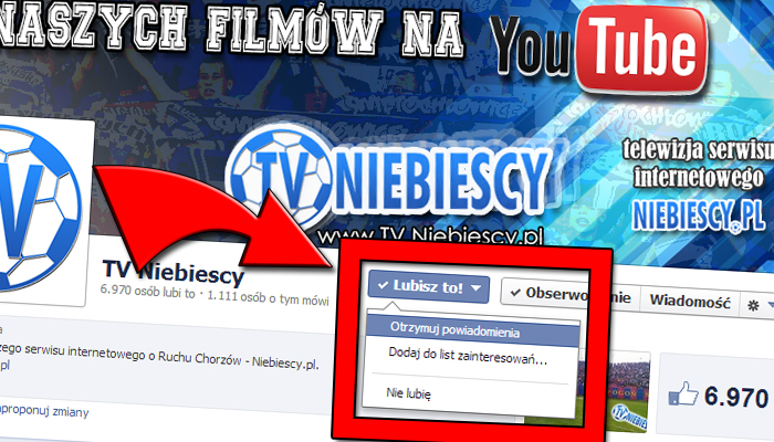 Wszystkich użytkowników Facebooka, którzy polubili Fan Page serwisu Niebiescy.pl oraz TV Niebiescy, zachęcamy do zaznaczenia przy nich opcji "Otrzymuj powiadomienia". Na poniższych zdjęciach możecie zobaczyć, jak to zrobić. Dzięki temu od razu zobaczycie publikowane przez nas informacje. Odkąd Facebook zmienił swój algorytm, niestety nie wszystkie posty pojawiają się na Waszych tablicach. Zaznaczenie opcji "Otrzymuj powiadomienia" rozwiąże problem.