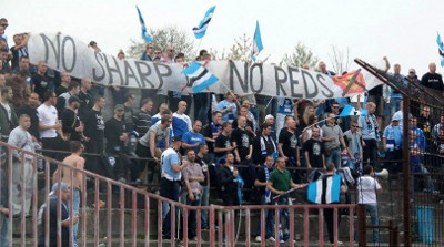 Na płotach pojawiły się m.in. flagi "Slovan Jugend", "Belasa Slachta on tour", "Fight United", "Hubu Drź". Na sektorze natomiast pojawił się transparent "No sharp, no reds" z przekreślonym sierpem i młotem.