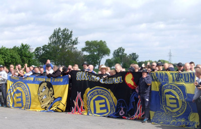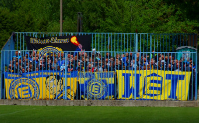 200 kibiców Elany. Pomimo przyznanej puli 100 biletów ostatecznie większości udało się zasiąść na sektorze gości, a kilkanaście osób pozostało pod stadionem. Na płotach zawisły flagi "Ultras Elana", "W[E]T", "Ekipa Wyjazdowa", "Mokre on tour" oraz mała fanka Rubinkowa. Przez cały mecz w asyście bębna prowadzony był dobry doping. Niestety pomimo prowadzenia 2:0 Elanowcy zdołali jedynie zremisować 2:2.