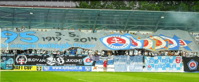 Na płotach zawisły m.in. flagi "Ultras Slovan Pressburg", "Slovan Jugend", "Hubu Drź", "Devinsky Masaker", "Belasa Shlachta on tour". Kibice Slovana zaprezentowali transparent "Nepriateľ môjho nepriateľa je môj priateľ", czyli "Wróg mojego wroga jest moim przyjacielem" oraz zaprezentowano oprawę na 95 rocznicę powstania klubu oraz odpalono pojedynczą pirotechnikę.