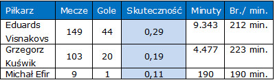 Grzegorz Kuświk słabo rozpoczął obecny sezon. Gdy w zeszłym statystycznie trafiał co trzy spotkania, to obecnie po siedmiu kolejkach ma tylko jedną bramkę na koncie. Wydawać by się mogło, że lepszej sytuacji już mieć nie mógł - brak konkurencji. Do klubu ściągnięto jednak Eduardsa Visnakovsa, który w debiucie od razu strzelił gola. Gdy jednak spojrzymy na statystyki minutowe to okazuje się, że i Kuświk i Visnakovs bramki zdobywają z podobną częstotliwością. Różnica wynosi około 10 minut.