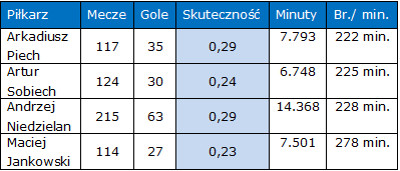 Tabela obejmuje występy w najwyższych klasach rozgrywkowych. W przypadku Polski jest to T-Mobile Ekstraklasa. Skuteczność wyraża stosunek zdobytych bramek do rozegranych spotkań. Dane zebrane na podstawie serwisu transfermarkt przed ostatnią kolejką ligową.