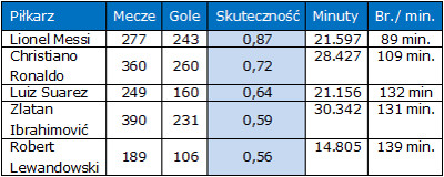 Na zakończenie spójrzmy, jak strzelają najlepsi na świecie. Oczywiście trzeba wziąć pod uwagę różnicę poziomu, jaki jest pomiędzy ligą polską, a Bundesligą, czy La Ligą. Skutecznością niemal idealną popisuje się Leo Messi, który statystycznie trafia w każdym spotkaniu ligi hiszpańskiej. A pamiętajmy, że Messi gra przecież prawie w każdym spotkaniu Ligi Mistrzów.