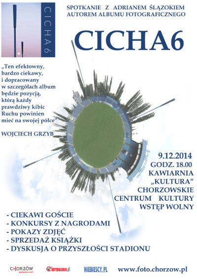 W Klubokawiarni "Kultura" w Chorzowskim Centrum Kultury, ul. Sienkiewicza 3 odbędzie się dzisiaj spotkanie poświęcone albumowi fotograficznemu "Cicha 6", którego autorem jest chorzowianin Adrian Ślązok. W programie znajduje się m.in. dyskusja na temat przyszłości naszego stadionu.