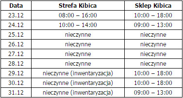 Godziny otwarcia Strefy i Sklepu Kibica w okresie świątecznym