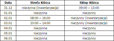 Ruch Chorzów zaprezentował harmonogram godzin otwarcia Strefy Kibica na stadionie przy ul. Cichej 6, a także Sklepu Kibica przy ul. Wolności 62 w okresie noworocznym. Prezentujemy go poniżej.