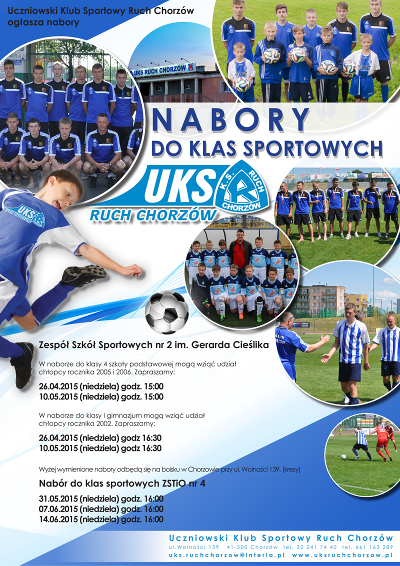 Uczniowski Klub Sportowy Ruch Chorzów zaprasza młodych adeptów futbolu na nabory do klas sportowych, które zostaną utworzone w Zespole Szkół Sportowych nr 2 im. Gerarda Cieślika oraz w Zespole Szkół Technicznych i Ogólnokształcących nr 4 w Chorzowie. Pierwsze nabory odbędą się już w najbliższą niedzielę.