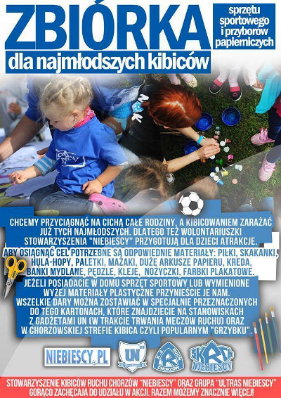 Wolontariuszki Stowarzyszenia Kibiców Ruchu Chorzów "Niebiescy" zwracają się ponadto z prośbą do Niebieskich fanatyków o wsparcie ich działań. Wszystkich, którzy chcieliby wspomóc akcje dla dzieciaków prowadzone zarówno na stadionie jak i poza nim, zachęcamy do przynoszenia materiałów plastycznych i sportowych. Na piątkowym meczu będą one zbierane koło stanowiska z gadżetami grupy "Ultras Niebiescy" oraz na sektorze 1. Cały czas można je zostawiać także w "Grzybku".
